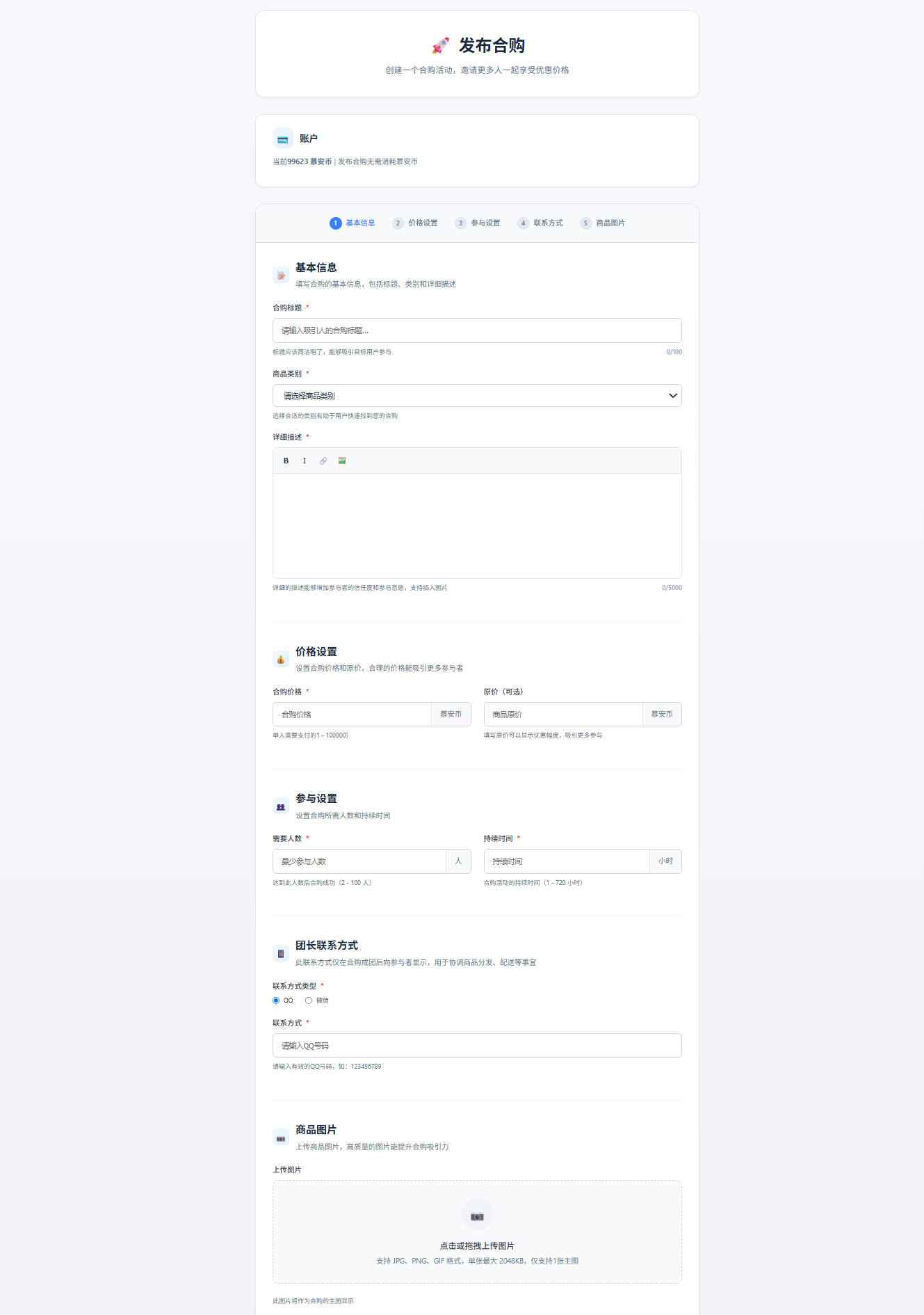– 发起人可以快速创建合购,设置所需人数、价格、有效期与分类标签。