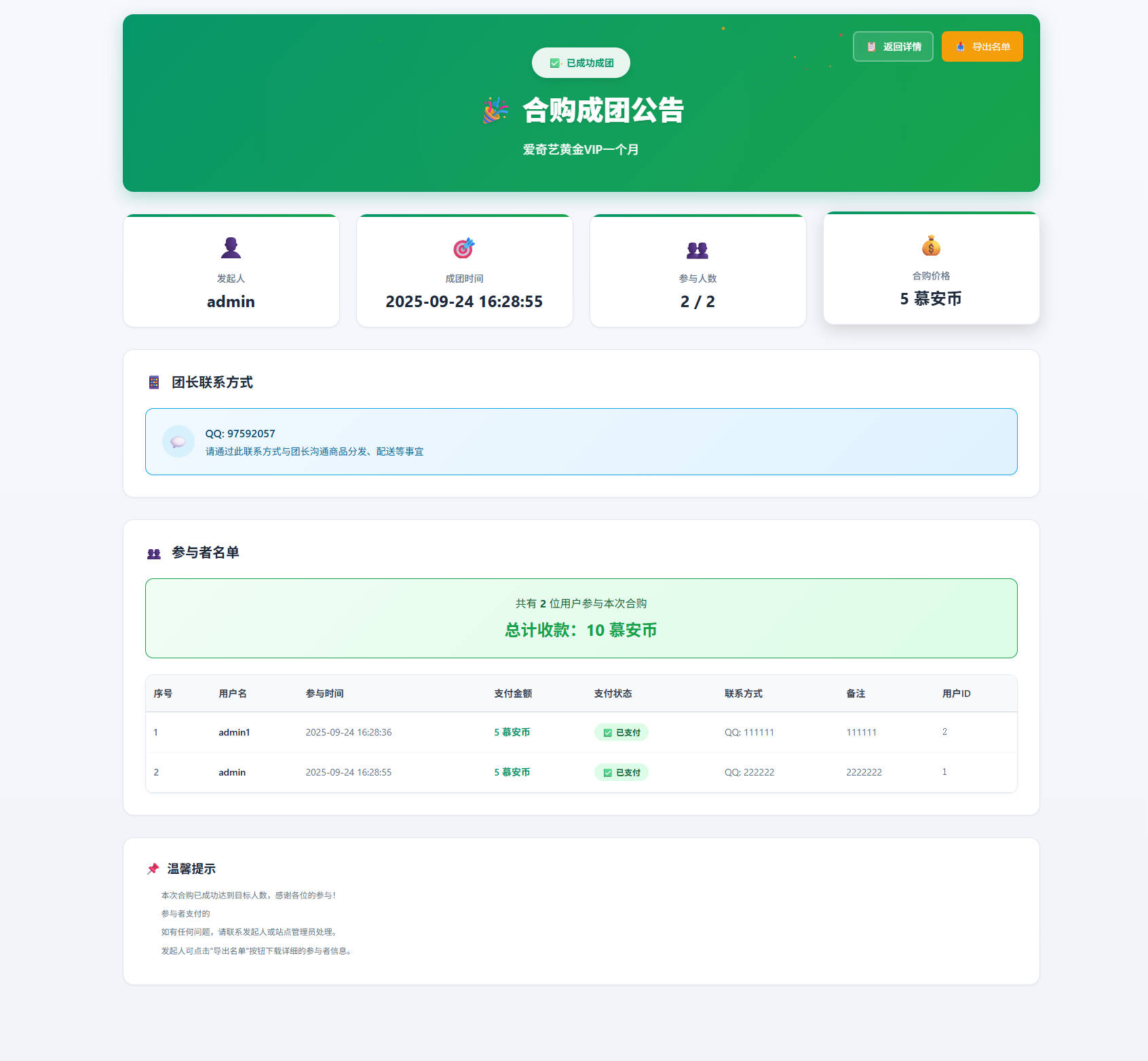 – 成团公告页展示参与者名单、支付状态与概览信息,支持导出。